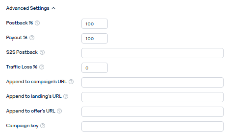 Traffic Loss – если вы заметите, что рекламная сеть пишет «1000 кликов», а трекер видит только 900, здесь можно вписать 10%, чтобы статистика была ровнее. Но в начале оставьте 0.