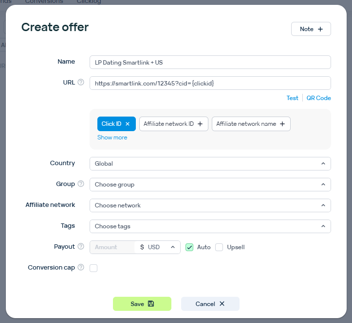 Conversion cap оставьте пустым. Это нужно, если партнерка ограничивает вас, например, 100 конверсиями в день. У LosPollos лимитов на смартлинках нет. Готово, сохраните оффер.