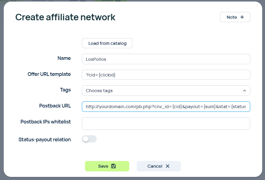 В Binom есть готовые шаблоны – с ними не придется прописывать параметры вручную для каждого оффера. Зайдите во вкладку Affiliate Networks, нажмите +Create и Load from catalog. Выберите сеть, часть настроек подтянется автоматически.