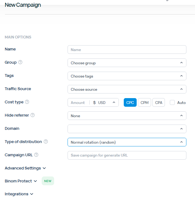 Cost type – обычно выбирают CPC (оплата за клик). Если источник передает цену клика автоматически, поставьте галочку Auto. Выберите Domain, который вы привязали к Binom. Это будет основной адрес вашей ссылки.